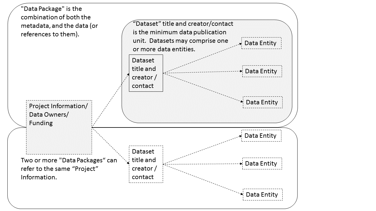 The figure below shows EML as a hierarchy. An EML document contains a dataset module that allows the grouping of one or more data entities (e.g. a file) linked together by particular rules to form a Data Package. The project module places the dataset that is being documented into its larger research context, and allows multiple related Data Packages to be linked.